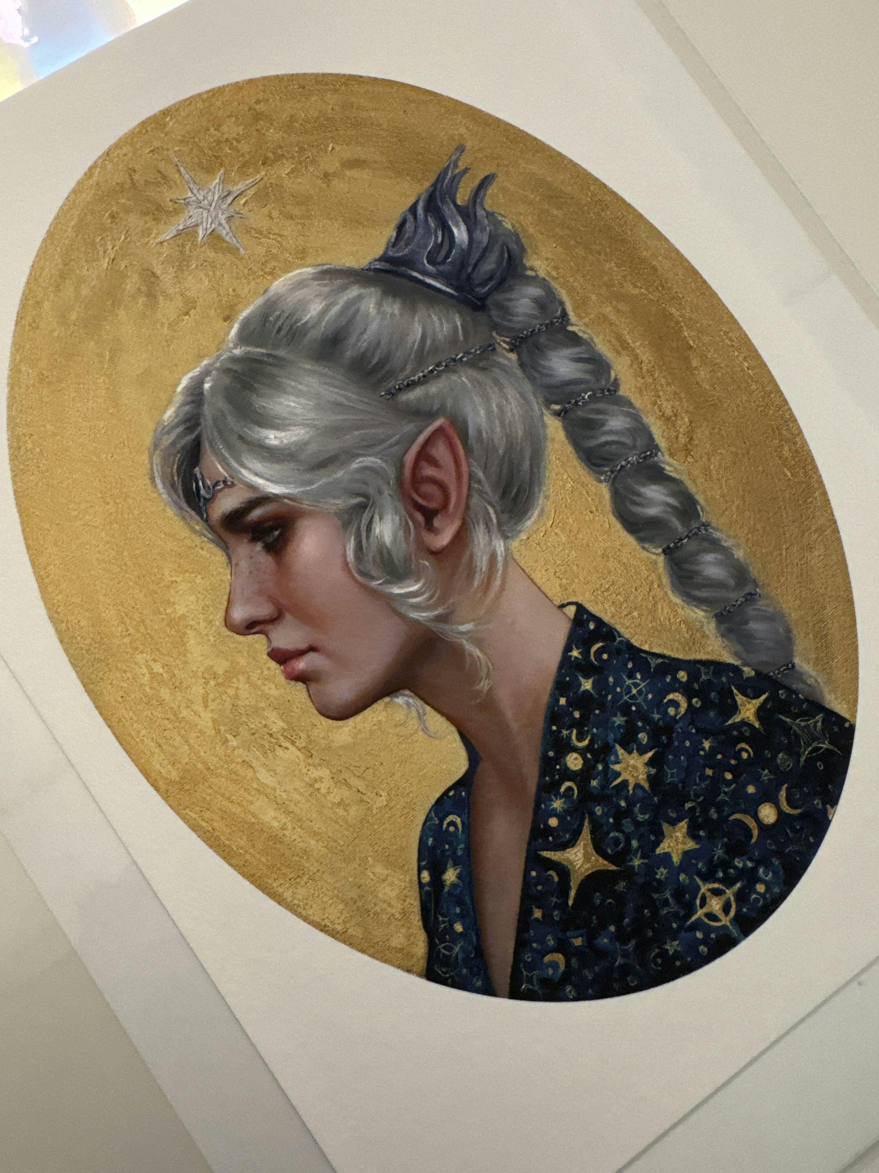 Shadowheart painting has gold paint BUT print does not, it is matt.